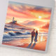 A dreamy coastal scene unfolds at golden hour, where a couple strolls along the shoreline beneath a glowing sunset and a distant lighthouse. Soft pastel skies blend coral, peach, and warm amber tones with rolling ocean waves, creating a tranquil, romantic atmosphere. The painterly style feels whimsical and cozy, evoking cottagecore and coastal folk aesthetics with a gentle sense of wander and togetherness. AI generated artwork.