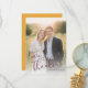 This wedding thank you card features a romantic and elegant design with a photograph of a couple standing closely together in an outdoor setting, surrounded by lush greenery and soft sunlight. The warm colour palette includes soft yellows and greens from the natural environment, contrasted with deep navy blue and light cream hues, creating a harmonious blend that evokes feelings of warmth and affection. The typography is sophisticated, with "love & thanks" written in a flowing script font at the bottom left corner, adding to the classic and timeless aesthetic suitable for formal occasions like weddings or engagements. The overall mood conveyed by the design is one of joy, love, and celebration, enhanced by the bright lighting and genuine smiles of the subjects.