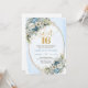 Celebrate a milestone moment with this elegant Sweet Sixteen invitation, featuring a refined watercolor design of dusty blue florals blended with soft white flowers and fresh eucalyptus greenery. Framed by a shimmering gold glitter border and paired with graceful script lettering, this invitation sets a sophisticated tone for a truly unforgettable Sweet Sixteen, Sweet 16th, or 16th birthday celebration.