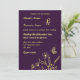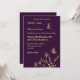 Unique simple wedding invitation featuring romantic and elegant gold flowers and a butterfly on purple background