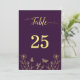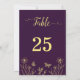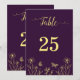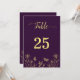 Unique simple table number card featuring romantic and elegant gold flowers on purple background