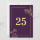 Unique simple table number card featuring romantic and elegant gold flowers on purple background
