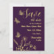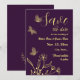 Unique simple wedding save the date card featuring romantic and elegant gold flowers and butterflies on purple background