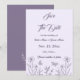 Unique simple wedding save the date invitation featuring romantic and elegant mauve flowers and butterflies on light purple background