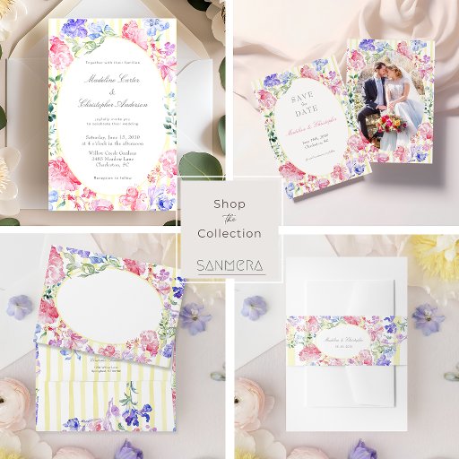 This watercolor floral Regency style wedding invitation belly band is a beautiful way to send your invitation. The design features colourful watercolor flowers and a stylish striped background, suggesting a touch of Regency-era elegance, perfect for a spring or summer floral wedding. You can customise this belly band for a polished wedding look.