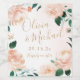 Modern calligraphy couples names surrounded by watercolor peach floral and botanical greenery, elegant and romantic, great for modern wedding, romantic wedding, and botanical garden wedding in spring and summer.