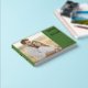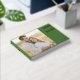 This wedding guest book features a split layout with a large photo placeholder on the left, showcasing a couple in a warm, natural setting. The right side is adorned with a bold green block that contrasts beautifully with elegant gold typography, offering customisable space for names and details. The design combines modern colour blocking with classic elements, creating a romantic and intimate mood perfect for capturing memories from your special day.