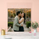 This wedding sign features a romantic and intimate design with a central photograph of two individuals embracing in front of a beautifully lit greenhouse. The warm amber and yellow lights contrast with the soft greens and whites of their attire, creating a cosy and inviting atmosphere. Elegant cursive typography at the top reads "welcome," while customisable placeholders for names and dates are presented in uppercase serif and simple sans-serif fonts below the image. The overall layout is balanced and centred, emphasising joy and celebration, making it perfect for enhancing the ambiance of your special day.