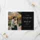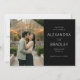This wedding save the date features a split layout with a romantic photograph of a couple embracing in front of a warmly lit greenhouse, creating an intimate and cosy atmosphere. The right side showcases elegant text on a black background, using sophisticated serif fonts that highlight the event details. The colour palette combines natural greens and browns from the foliage with warm yellow hues from the string lights, evoking a classic and timeless feel. Perfect for setting the tone for a memorable celebration, this design balances visual charm with clear communication, making it ideal for couples looking to share their special news with style.