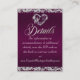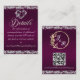 This romantic design features a purple plum background with glitter borders, a delicate silver scroll heart, details for more information on the front and QR code and monogram placeholder on the back. Also available with different coloured backgrounds for your wedding theme colours. (Glitter is simulated in the artwork). Designed to coordinate with the "Romantic Scroll Hearts & Glitter Wedding" Collection. To change details, click «Personalise». To move the text or change the text size, font, or colour click «Click to customise further»