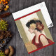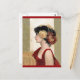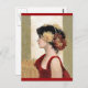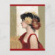 This vintage image has an elegant, romantic woman in a red dress. She has large red and yellow flowers in her dark hair. She is holding a bouquet of flowers. The background is white and tan with a deep red border. See my store Art by MAR for matching products with this design.