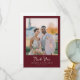 This wedding thank you card features a romantic and celebratory design with a central photograph of two individuals standing closely together, set against a softly blurred background. The warm color palette includes peach, beige, soft pink hues from the clothing, complemented by greenery and autumnal tones. A wide maroon border frames the image, adding contrast and elegance, while the text at the bottom is arranged in an elegant script font, emphasizing gratitude. The overall mood is joyful and heartfelt, perfect for expressing appreciation after a special occasion.
