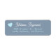 Your home address personalised in a easy way... in a nice dusty-blue label with two lines of text aligned by centre, and your name written in a stylish script font style with the image of a small heart of love