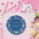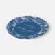 This elegant wedding plate features a serene pastoral scene with trees, bridges, and small buildings set against a deep navy blue background. The intricate white illustrations create a continuous landscape, while the central circular element highlights customizable text in a classic serif font. The monochromatic color palette of blue and white exudes sophistication and tranquility, making it perfect for formal celebrations. Ideal for weddings or romantic events, this design combines tradition with a touch of idyllic charm.
