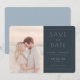This wedding save the date features a split layout with a romantic beach photograph on one side and elegant navy background on the other. The design combines soft, natural lighting from the photo with clean serif and sans-serif typography for a modern yet timeless look. Its minimalistic color palette of warm beige, light blue, and deep navy creates a serene and intimate mood, perfect for announcing your special day. The clear hierarchy and ample negative space ensure readability while maintaining an inviting and sophisticated aesthetic.