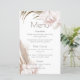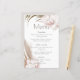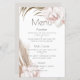 This elegant and romantic wedding menu features a tropical, boho floral watercolor design. Beautiful flower bouquets of blush coloured orchids, pampas grass, and palm leaves are pictured in the top left and bottom right.