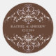 Romantic antique ornaments in white against a rich brown background serve as a framework for this sticker. Fully customise it with your own name(s) and event date. Stick it on envelopes or correspondence, seal favour bags, label boxes, etc. A sticker suitable for any occasion: weddings, engagement parties, a save-the-date or a corporate event. Available in alternate colours with matching products.