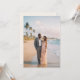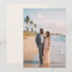 This wedding invitation features a serene beach scene with two individuals standing close together on the sand, facing each other. The composition captures a wide view of the shoreline and ocean, with palm trees scattered along the horizon, creating a balanced layout. The colour palette includes soft pastels with light blue skies and water, sandy beige shores, and muted green palm trees, evoking a warm and inviting atmosphere. The photographic style emphasises natural beauty and candid moments, making it perfect for conveying themes of love and relaxation in a contemporary setting.