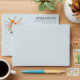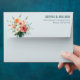 This wedding envelope features a beautifully balanced design with a floral arrangement on the left, showcasing peach, white, and pink roses accented by green foliage and blue berries. The right side displays elegant serif typography for names and addresses, creating a harmonious blend of illustration and text. The soft pastel color palette against a light background evokes a serene and romantic mood, perfect for formal occasions. With its hand-painted watercolor style, this envelope combines artistic charm with timeless elegance, making it ideal for weddings or special celebrations.