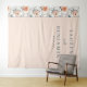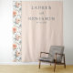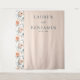 This elegant wedding backdrop features a soft peach background with a vertical floral border of large roses in shades of peach and cream, creating a romantic frame. The design includes customisable text in a clean serif font, with the word "and" styled in cursive for added elegance. The overall style is classic and sophisticated, perfect for formal occasions, with a warm and inviting mood enhanced by the harmonious colour palette and gentle floral accents.