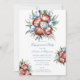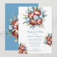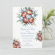 A beautifully illustrated bouquet of flowers. The bouquet consists of large, vibrant peonies in shades of terracotta and blue, complemented by smaller blue tulips. There are also green leaves and golden accents, possibly representing stems or other floral elements. The flowers are centrally positioned, with a pair of intertwined golden rings placed amidst them. The entire composition is set against a white background, emphasising the colours and details of the flowers. With two wedding rings in the centre of the flowers.