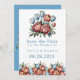 A beautifully illustrated bouquet of flowers. The bouquet consists of large, vibrant peonies in shades of terracotta and blue, complemented by smaller blue tulips. There are also green leaves and golden accents, possibly representing stems or other floral elements. The flowers are centrally positioned, with a pair of intertwined golden rings placed amidst them. The entire composition is set against a white background, emphasising the colours and details of the flowers.