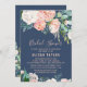 This romantic peony flowers blue bridal shower invitation card is perfect for an elegant bridal shower. The floral design features blush pink, peach and white cascading watercolor flowers on a navy blue background.