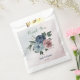 Beautiful botanical wedding favour bag featuring pink, dusty blue and navy blue flowers with green leaves.
