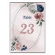 Beautiful botanical table number card featuring romantic pink, white and navy blue flowers with green leaves.