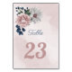 Beautiful botanical table number card featuring romantic pink, white and navy blue flowers with green leaves.