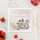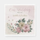 Unique wedding paper napkin featuring romantic pink and champagne flowers and green leaves.