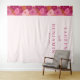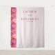 This elegant wedding backdrop features a minimalist design with a vertical layout, divided into two sections. The left side showcases a vibrant floral pattern in shades of pink and coral, while the right side is clean white, creating a striking contrast. Centred on the white background is sophisticated text in serif and cursive fonts, adding a touch of romance to the modern aesthetic. Perfect for celebrating love, this backdrop combines nature-inspired motifs with chic typography, setting a joyful and sophisticated tone for your special day.