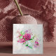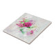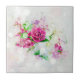 Beautiful ceramic tile design featuring romantic floral composition with pink roses, greenery, bokeh and sparkles on white wooden background.