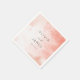 This wedding napkin design features a soft, watercolor background in pale pink and white hues, creating an ethereal, cloud-like effect. The layout is centred with elegant typography, combining clean sans-serif fonts for the names and a delicate cursive script for "and," enhancing its romantic charm. The minimalist style emphasises simplicity and clarity, making it perfect for intimate celebrations. Its serene mood and gentle colour palette evoke a timeless and dreamy atmosphere, ideal for special occasions like weddings.