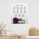 This elegant wedding seating chart has table assignments for 110 guests at 11 tables (10 people per table.) The design is beautiful, sophisticated, romantic and stylish. It features a single plum purple or eggplant coloured rose reflecting in water with waves and ripples. The title reads "please find your table" in lacy script calligraphy. There is space for the names of the couple and wedding date.