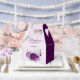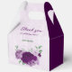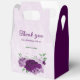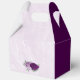 Beautiful romantic wedding guest book featuring purple flowers and some green leaves .
