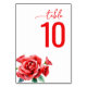 This wedding table card features a classic and romantic design with a white background that highlights the vibrant red text "table 10" in a mix of cursive and bold sans-serif fonts. A cluster of beautifully illustrated red roses with green leaves adds an elegant touch to the lower left, enhancing the sophisticated theme. The simple yet impactful layout creates a refined and warm atmosphere, perfect for adding a touch of elegance to your wedding reception seating arrangement.