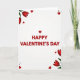 This card features the large headline “HAPPY VALENTINE’S DAY” centered in strong red lettering on a soft white background that fades gently at the edges, with a tiny red heart standing in for the apostrophe ❤️. Red tulips with deep green leaves lean in from the top-left corner and rise again from the bottom-right, as if two bouquets are reaching toward each other. Around the message, small solid red hearts are sprinkled like confetti, some floating near the flowers and others drifting closer to the words, adding a flirty, friendly warmth 🥰. A few tiny black dots sit between the hearts and tulips, giving the layout a modern, lightly textured look without stealing focus. The red of the text matches the tulip petals, tying everything together so the center message feels hugged by the corner florals. The lettering stays clean and easy to read, with the brightest red concentrated in the main line and the heart-apostrophe acting as a sweet visual wink. In the corners, the tulip petals are a rich crimson while the leaves are layered in green, with scattered red hearts and small black dots filling the open space.