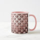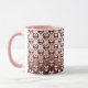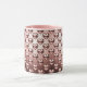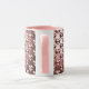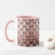 This mug features metallic rose gold hearts in a grid formation on a gradient background. Each heart has a glossy, three-dimensional appearance with a curved surface that creates a dimensional effect. The hearts are the same size and shape with a subtle sheen and highlights that give them a polished, luxurious look. The background transitions from a lighter rose gold tone at the top to a burgundy red at the bottom. The picture has a romantic, Valentine's Day theme with its heart shapes and warm colour palette. The mug is a Pink Combo Mug. The mug is microwave and dishwasher safe.