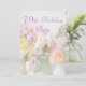 Elegant 70th birthday party invites flat cards for women's birthday parties, with a photograph of beautiful colourful peach, pink, white, yellow, and lilac coloured roses flowers bouquets arrangements in fashionable old fashioned vintage glass mason jars. These glamourous, romantic soft focus shabby chic, classy, floral designed 70th birthday / seventieth/seventy years are trendy, stylish and sophisticated and are printed/decorated on both sides. There is pretty 70th birthday party text on the front in a purple fancy cursive font. The reverse side of the card has a beautiful pearls and lace mat image. Pearls and lace mat by ©Hazel Kinvig-Paul www.design-a-dream.co.uk.