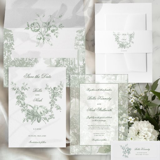 Romantic Sage Floral Wreath w/Lovebirds Wedding Vellum Invitations