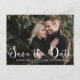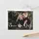 Whimsical and stylish save the date postcard featuring white modern calligraphy script. Similar items and other colours are available.