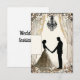Romantic silhouette of a couple holding hands, positioned at the centre. The woman is adorned in an elegant dress with intricate patterns, while the man is dressed in a formal suit. They are framed by a beautiful backdrop of flowing curtains, which suggest an atmosphere of intimacy and celebration. Above them hangs an ornate chandelier that adds a touch of elegance to the scene. The overall design is bordered with decorative floral motifs, enhancing its romantic and sophisticated vibe. A blank area at the bottom allows for personal messages or invitations.