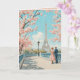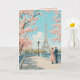 A beautifully illustrated 1950s-style travel poster depicting a romantic couple strolling beneath blooming cherry blossoms with the Eiffel Tower in the background. The pastel tones and retro aesthetic capture the timeless charm of springtime in Paris.