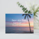 A breathtaking beach sunset scene featuring a golden and purple sky, calm ocean waves, and a black silhouette of a palm tree on the right. The warm hues reflect on the water, creating a romantic and serene atmosphere—perfect for a wedding invitation.