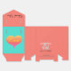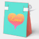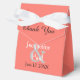 Love is written in sunny yellow inside of romantic sunset heart on back in shades of golden yellow orange to pink against a pretty coral pink colour background. Personalise with the Bride and Groom's First Names in white text and Date of Wedding in Black text. Thank you favours for bridal party and wedding reception guest.