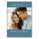 This wedding table card features a modern, minimalist design with a split teal background framing a central photograph of two individuals in an intimate pose. The layout is clean and balanced, using a combination of sans-serif and elegant script fonts to highlight the table number at the top and names below the image. The colour palette consists of soothing teal tones complemented by soft hues from the photo, creating a warm and romantic atmosphere perfect for a beach-themed wedding. The overall style blends simplicity with sentimentality, making it ideal for couples looking to add a personal touch to their special day.