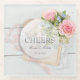 Adorable and editable wedding glass coaster template perfect for romantic vintage wedding or spring wedding with a beautiful fresh spring flower bouquet and a lot of cute historic details, ribbons, lace,forget-me-not flowers and pink roses in the background.