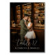 This wedding table card features a romantic scene set in an elegant bar, with two individuals embracing warmly. The design showcases a well-stocked bar illuminated by soft lighting, creating a cosy and inviting atmosphere. The colour palette includes warm tones of deep browns and amber hues, contrasted by the couple's lighter attire. Typography at the bottom highlights "Table 12" in a flowing cursive script, adding a touch of sophistication to the overall layout. Perfect for setting the mood at your special celebration, this card combines romance and elegance seamlessly.