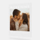 This wedding sign features a warm, romantic design with a central photograph of two individuals in an intimate pose, set against a backdrop of soft beige and brown tones. The layout is vertically oriented, with bold white text at the top spelling "WELCOME" and elegant cursive script below for customizable names, creating a personalized touch. The typography combines modern sans-serif and flowing script fonts, enhancing readability and adding sophistication. The overall mood is one of warmth and celebration, perfect for welcoming guests to a special occasion.